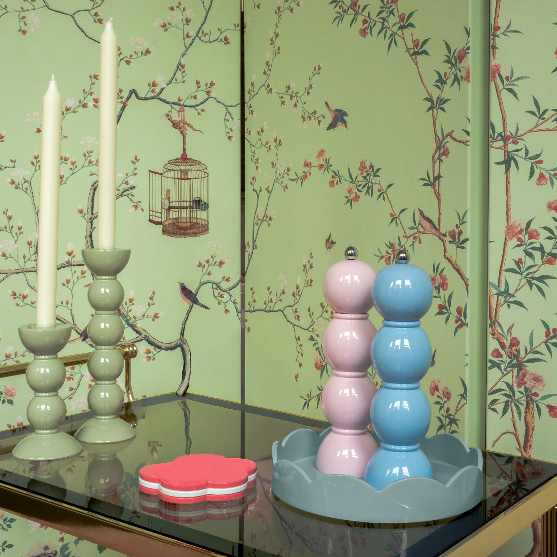 A pretty pale denim blue round scallop small tray finished in 20 coats of high gloss lacquer, hand polished between each coat. The base is painted black satin and embossed with our logo.